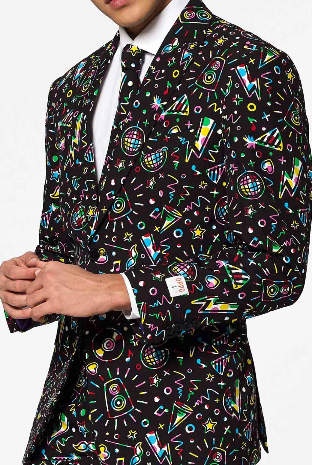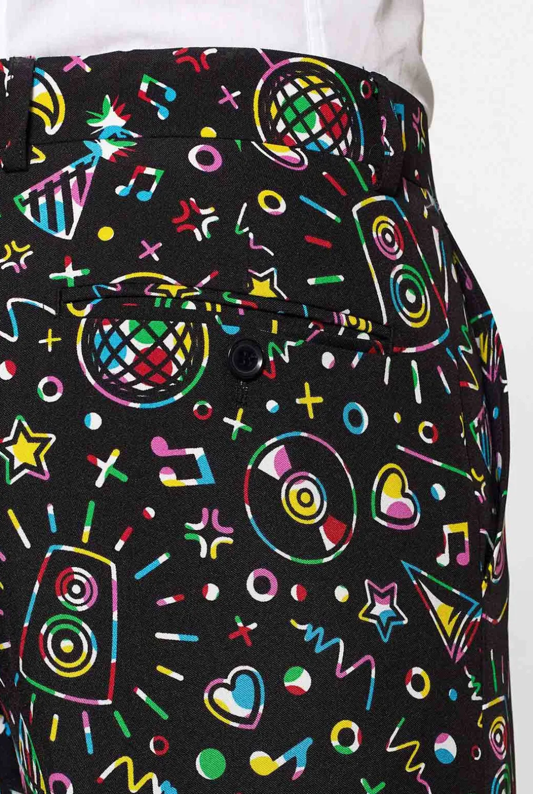 Vind je het leuk als alle ogen op jou gericht zijn zodra je binnenkomt? Draag dit discopak en iedereen weet meteen dat jij klaar bent voor een dansje. Dankzij de print met allerlei kleurrijke icoontjes op een klassieke ondergrond, weet je zeker dat je er super feestelijk uitziet terwijl je tegelijk ook nog eens stijlvol voor de dag komt.