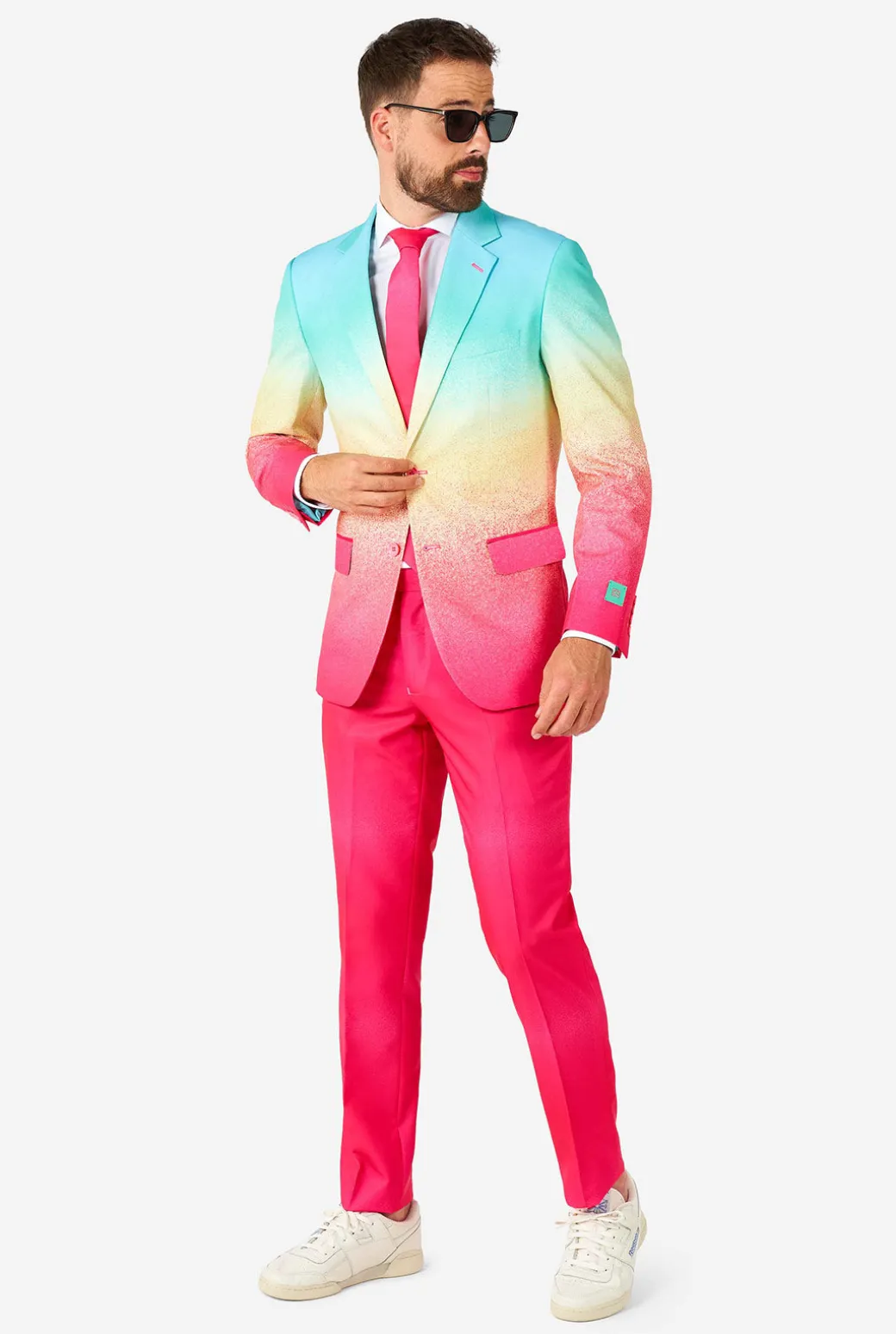 Wil je nooit in de vergetelheid raken? Wil je een blijvende indruk maken? Ben je dol op regenbogen? Ja, we snappen je. Funky Fade is een populair OppoSuits-ontwerp met warme, uitnodigende kleuren en is nu verkrijgbaar in een pak. Zorg voor een zonnige entree op je volgende bedrijfsfeest, festival, schoolfeest, Pride-evenement en meer!