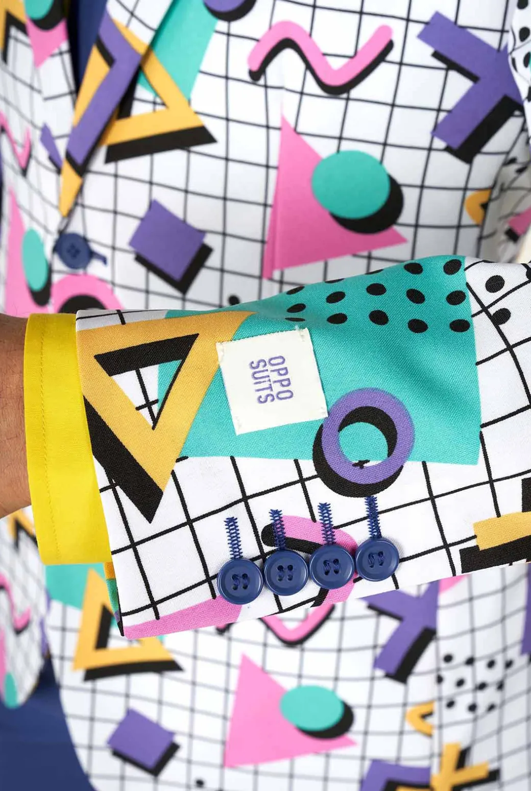 Als je van gedurfde kleuren, gekke patronen en rare vormen houdt, dan is dit het pak voor jou. Geïnspireerd door de legendarische ontwerpstijl die door de Memphis Group in de jaren 80 werd geïntroduceerd, combineert dit unieke pak felle kleuren met stilistische vormen en verandert het je in een wandelende art deco fashionista. Retro heeft er nog nooit zo stijlvol uitgezien, dus maak plaats voor de Memphis Master!