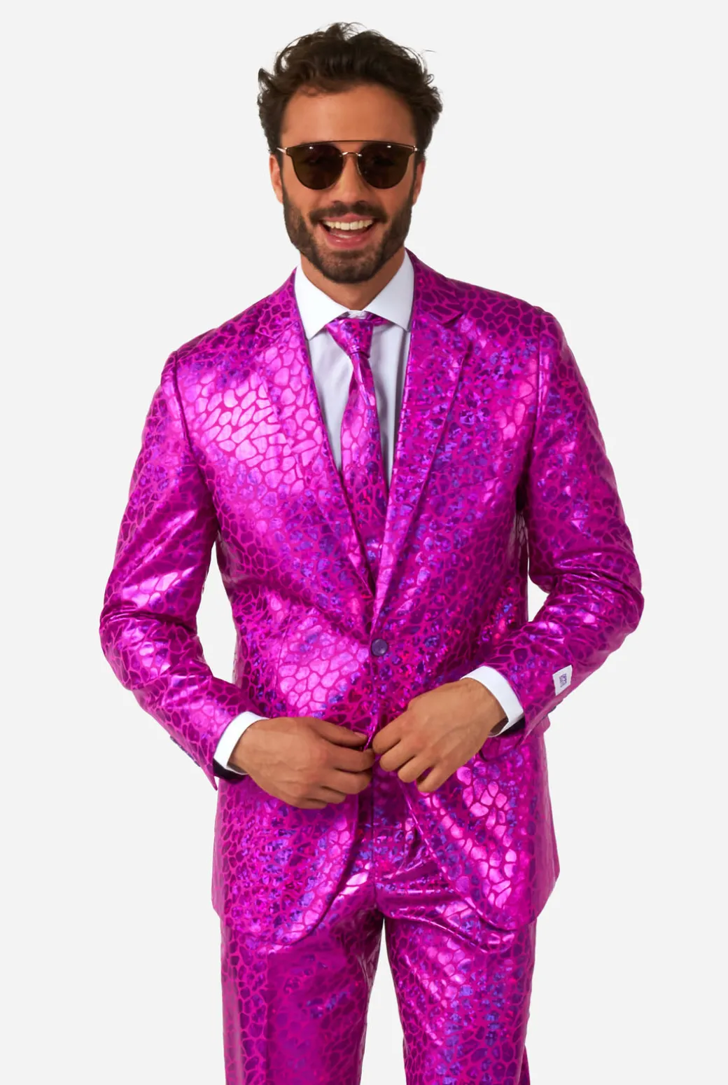 Ga op een missie van groovy muziek, fonkelende spiegelbollen en frisse couture. Dit glanzende pak is als een disco inferno van roze spiegeltegels, klaar om de dansvloer in vuur en vlam te zetten. Bereid je voor op boogie, verblinding en de nacht met de stralende Peppy Pink.