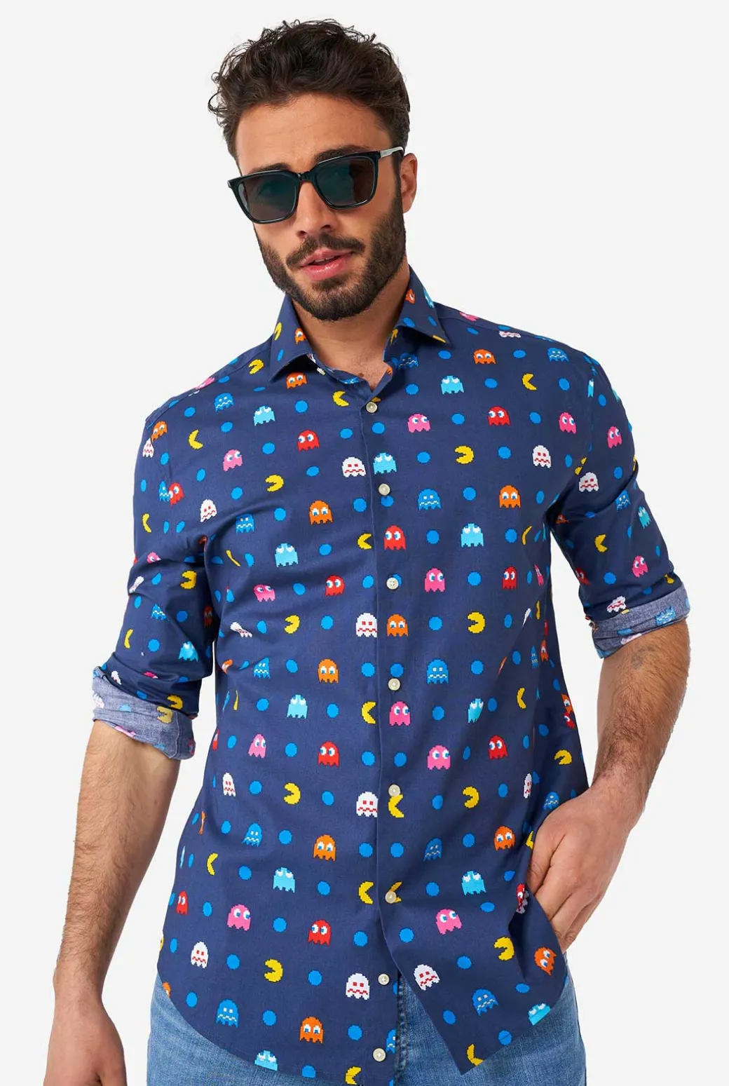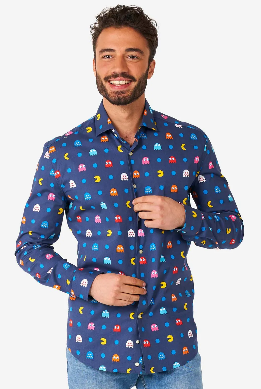 Inky, Blinky, Pinky en Clyde doen hun best om Pac-man op een dwaalspoor te brengen, maar ze zijn allemaal op dit shirt beland! Voor de retroliefhebbers die een klassiek spel in een klassieke pasvorm willen dragen, is het Pixel PAC-MAN™ overhemd met knoopsluiting de ideale manier om het ultieme eerbetoon aan de koning van gaming te dragen!