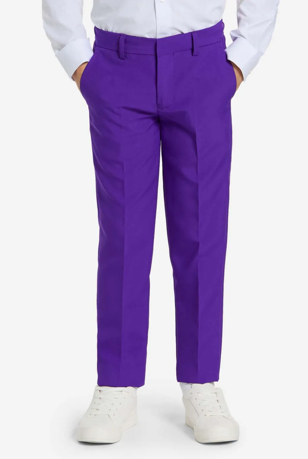Gewoon is nooit iets waar we naar streven. Daarom is dit kleurrijke pak een uitbarsting van paarse zwier die een heel nieuw niveau van coolheid brengt. Draag het naar bruiloften of op schoolevenementen en kijk hoe de schijnwerpers volgen. Maak je klaar, jonge trendsetters; het is tijd om de stad paars te schilderen!