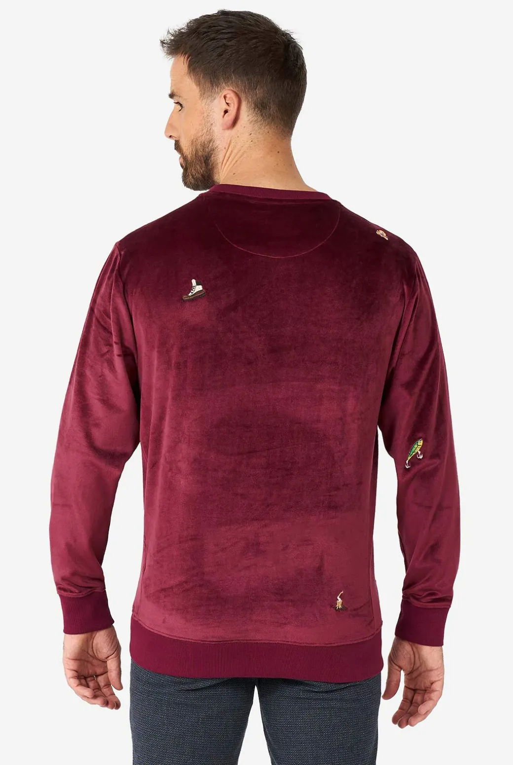 - Sweater: Geborduurde iconen, Geborstelde binnenkant, Ribboorden van katoen en elasthaan