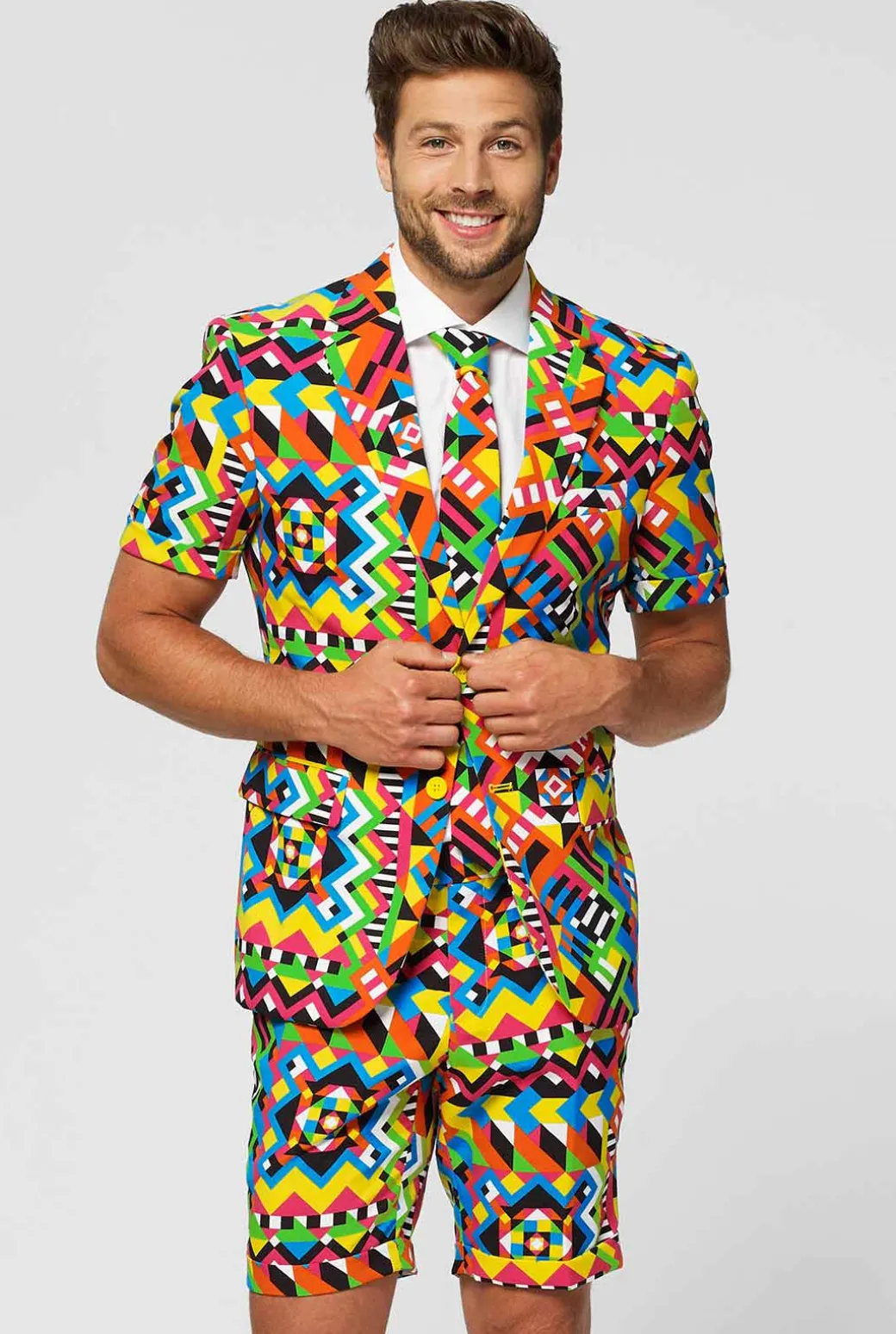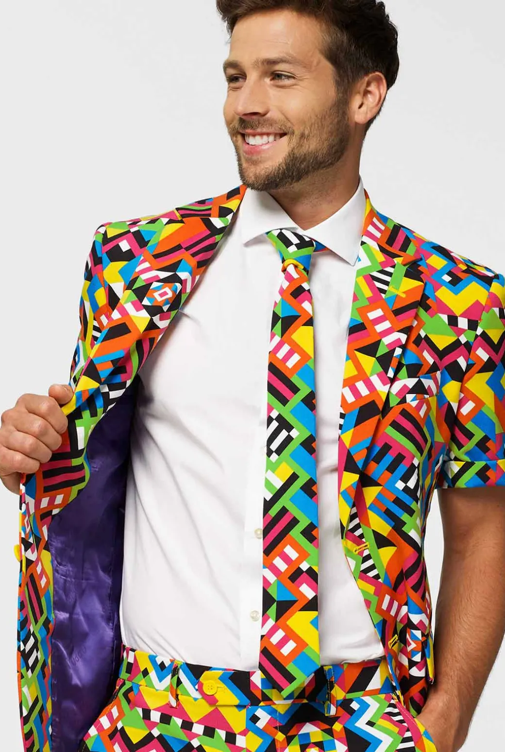 Kleding heeft een sterk effect op je humeur. Dus waarom zou je jeniet net zo uitbundig kleden als je karakter met dit kleurrijke pak? Het is een echte conversatiestarter, dus maak je klaar voor een hoge dosis aandacht. OppoSuits attract!