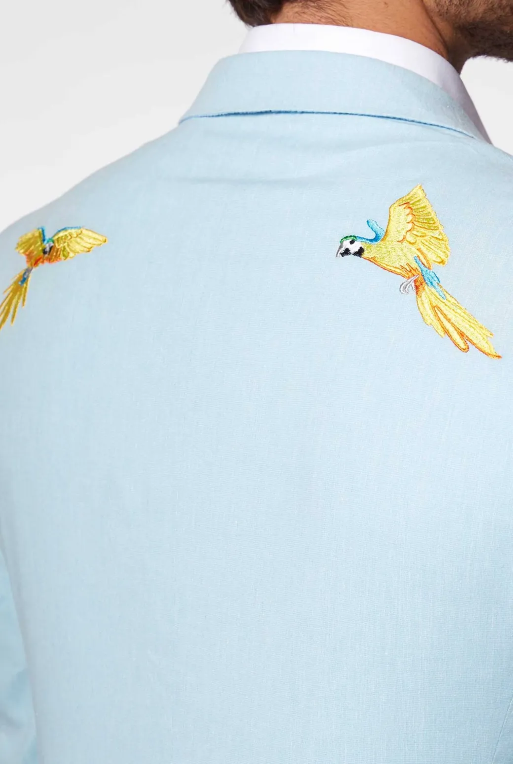 Liever één papegaai in je borstzak dan tien in de lucht. De lente en zomer zijn dé seizoenen om levendige stijlkeuzes te maken. Deze zachtblauwe OppoSuits Deluxe blazer is gemaakt van een luchtige, hoge kwaliteit katoen-linnen mix en daardoor perfect om jou cool te houden terwijl je stijlvol voor de dag komt. Met twee uit het oog springende, geborduurde papegaaien en een voering met palmbladeren heeft dit jasje het allemaal: fun, luxe en stijl.