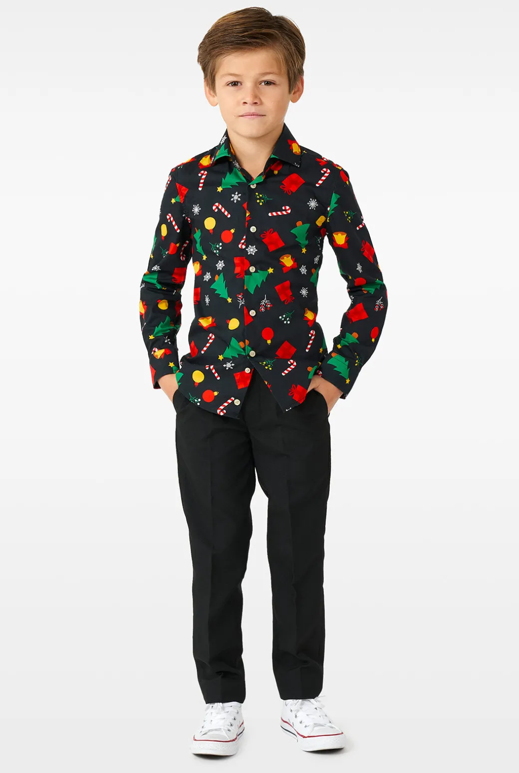 De meeste kinderen houden niet zo van formele kleding, maar in dit geval is het anders. Zodra hij dit overhemd met feestelijke kersticoontjes ziet, wil hij ‘m direct aantrekken. Hijj is grappig, stijlvol én comfortabel dus heeft alles wat je nodig hebt tijdens de feestdagen.