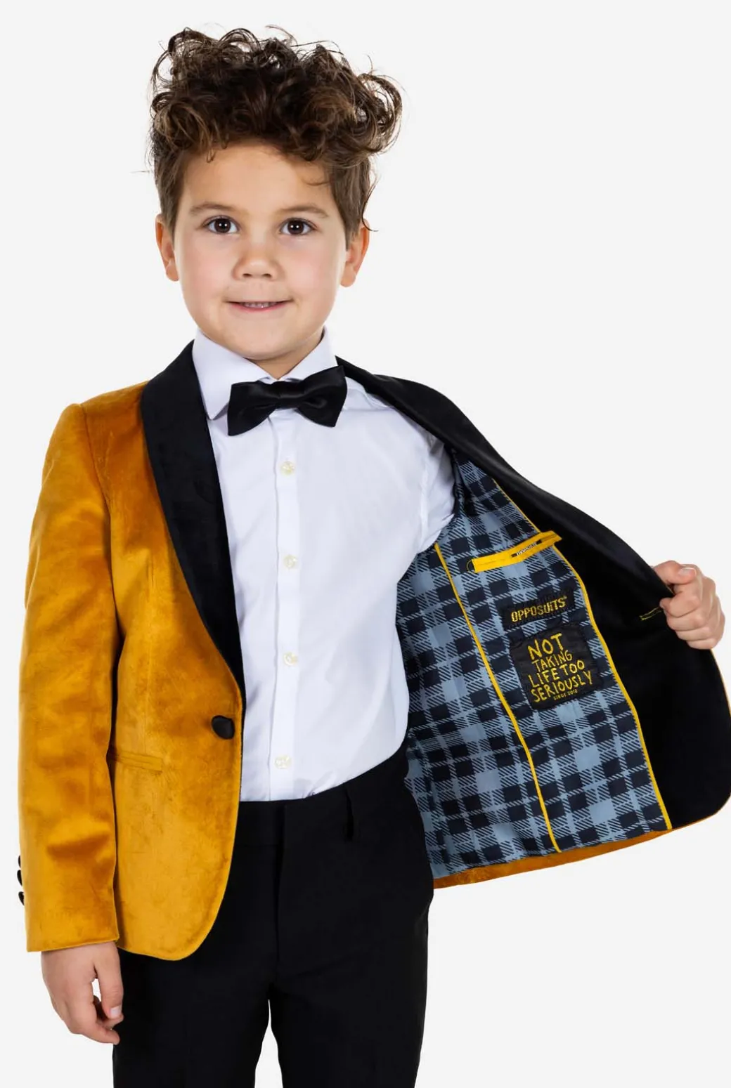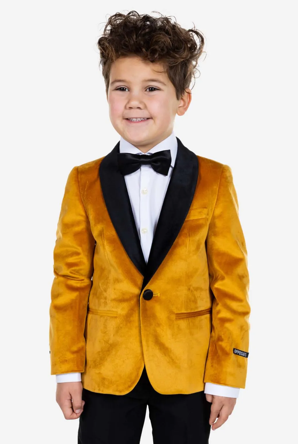 Voeg wat glitter en glamour toe aan de garderobe van je kleintje met ons goudfluwelen dinerjasje! Dit jasje is perfect voor elke chique gelegenheid en laat uw kind stralen als een ster. Gewoon stijlvol, met een vleugje plezier. (Geen paparazzi, alstublieft.)