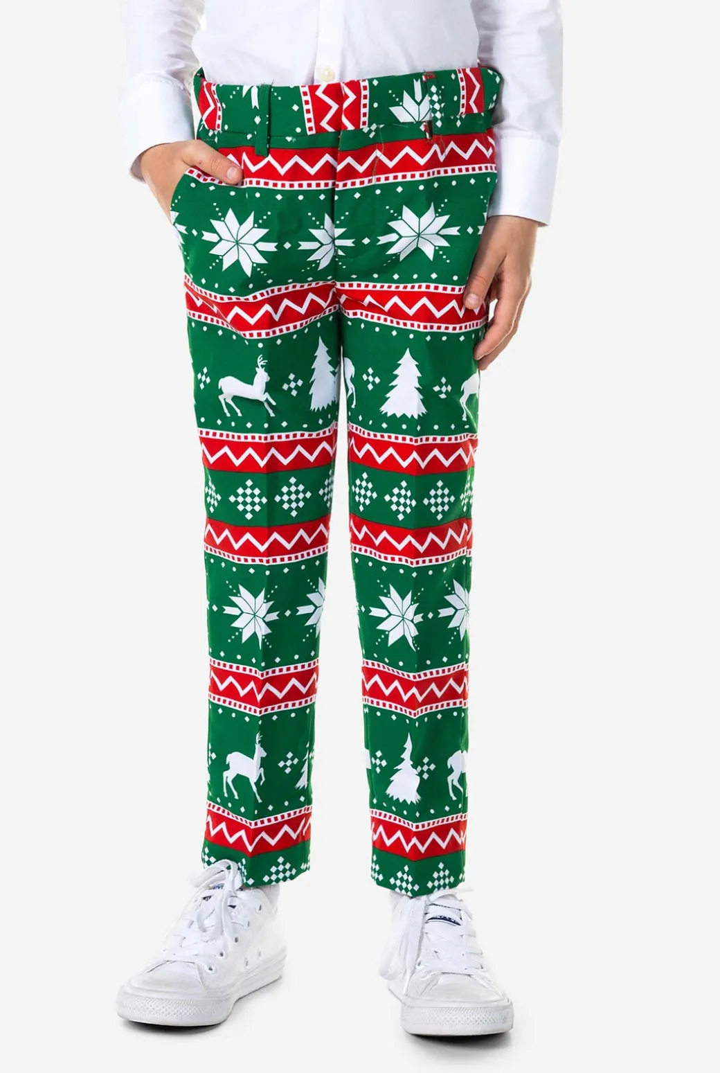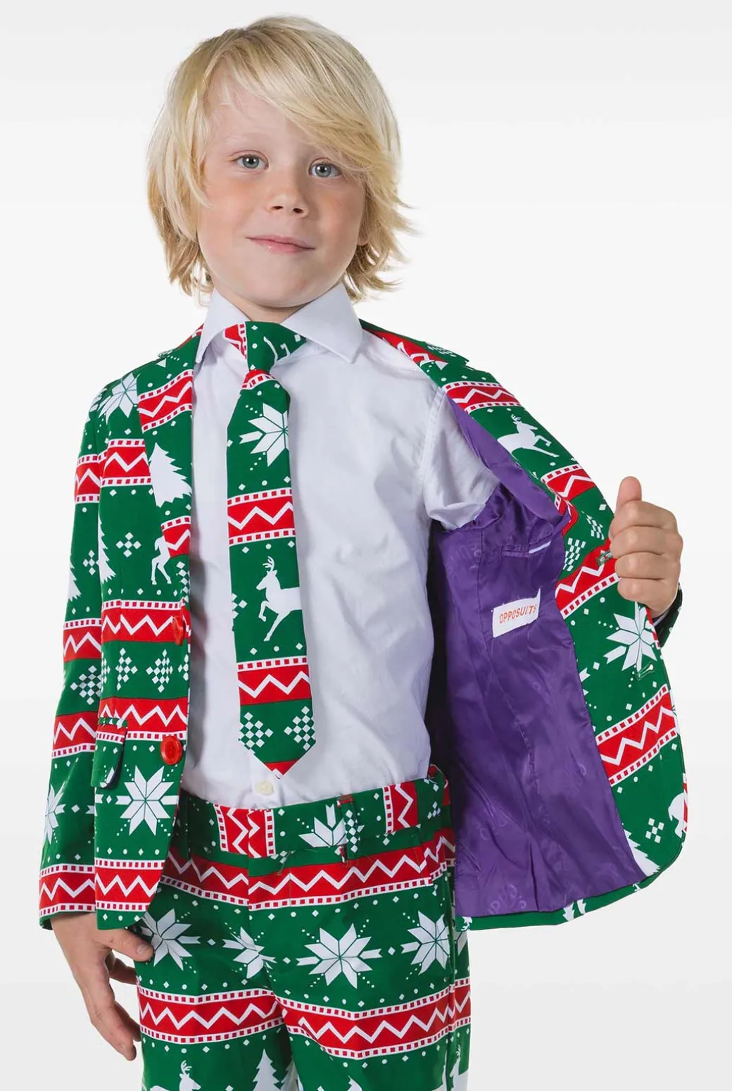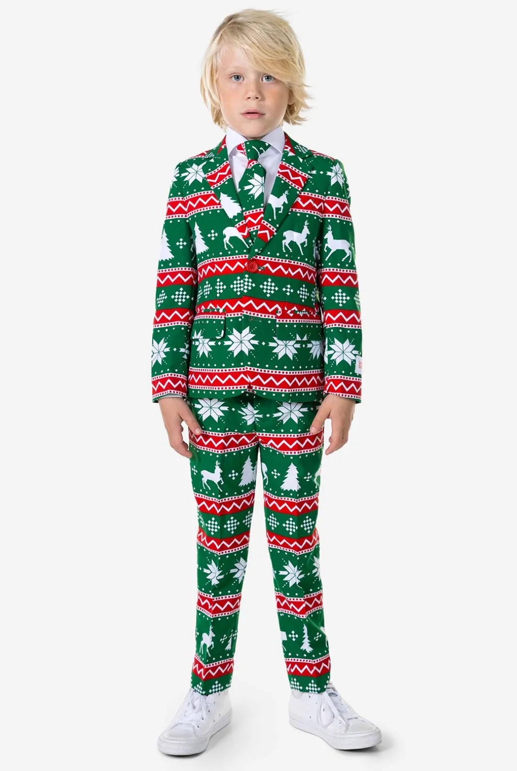 Dit groen met rode pak is een absoluut juweeltje voor de feestdagen. We zijn er zeker van dat je kleine man deze kerstlook zo goed zal rocken, dat de kerstman hem dit jaar alle cadeaus schenkt die hij maar wilt. Vrolijk kerstfeest!