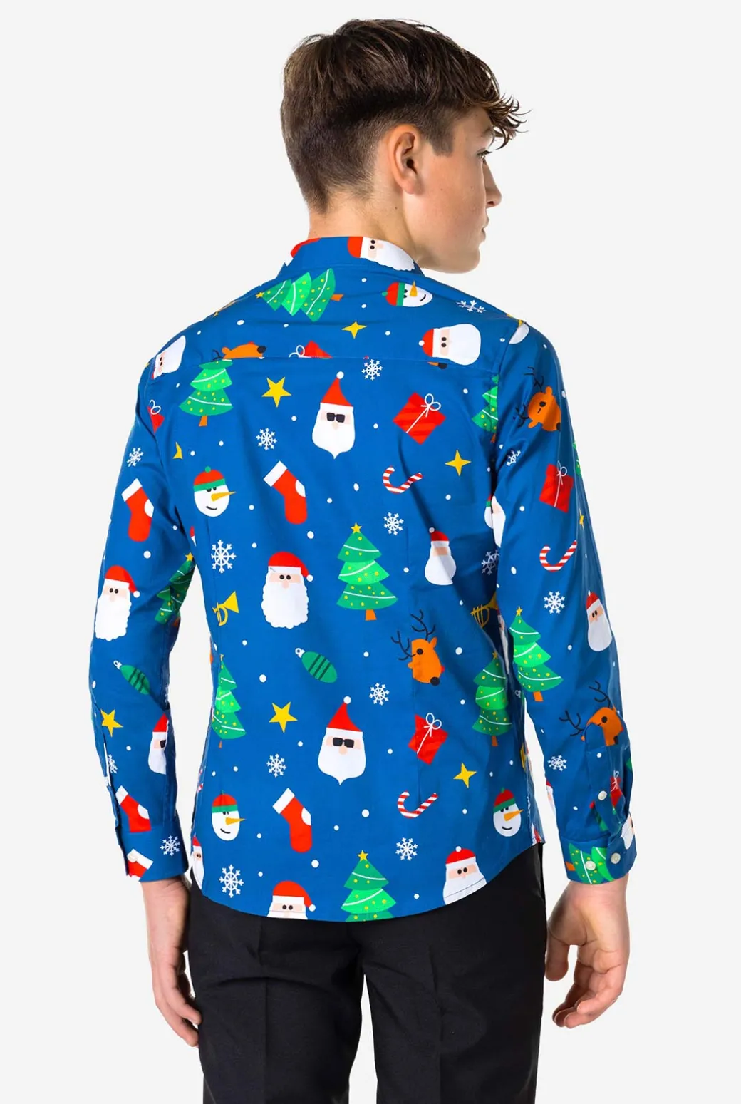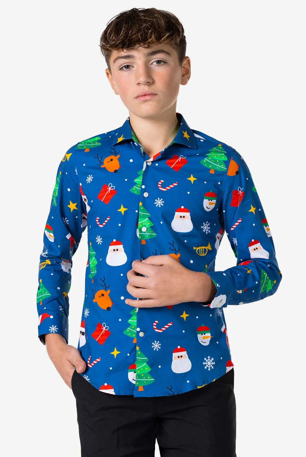 Wil je kind er extra cool uitzien en opvallen deze feestdagen? Zoek niet verder dan het blauwe Festivity-shirt. Het heeft de Kerstman, rendieren, kerstbomen en glinsterende sterren, dus het is perfect om te dragen in combinatie met een pak. Je hoeft het alleen maar te dragen!