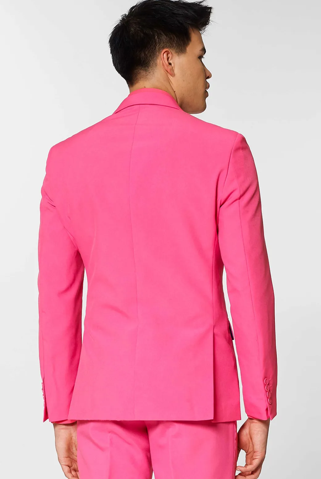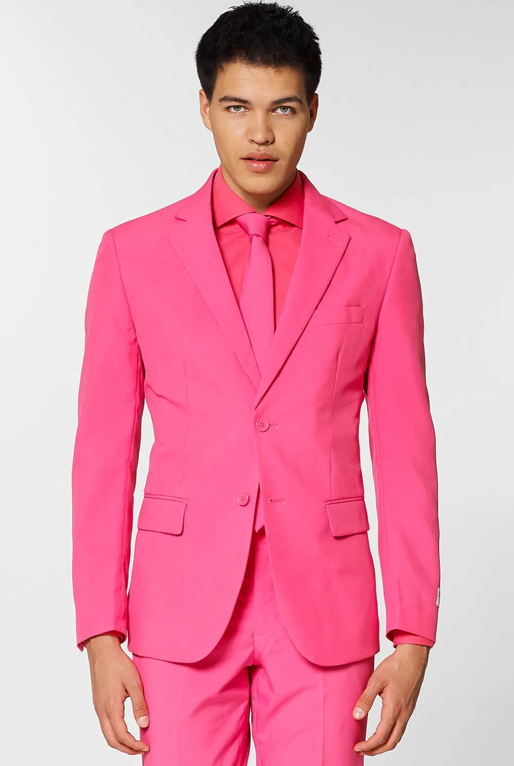 Voeg een vleugje speelse elegantie toe aan jouw garderobe met ons Mr. Pink pak voor heren. De felroze kleur straalt zelfvertrouwen en charme uit. Perfect voor die momenten waarop je écht wilt opvallen in stijl. Of het nu gaat om een chic feest of een informeel evenement, dit roze pak is de ultieme keuze om op te vallen wanneer jij dat wilt. Laat jouw persoonlijkheid nog meer schitteren in dit fantastische felroze pak van OppoSuits. Met deze OppoSuits-topper ga je vol zelfvertrouwen op weg naar een sollicitatiegesprek, verjaardagsfeest, bruiloft of Bar Mitzvah. En niet te vergeten.. echte mannen dragen absoluut roze!