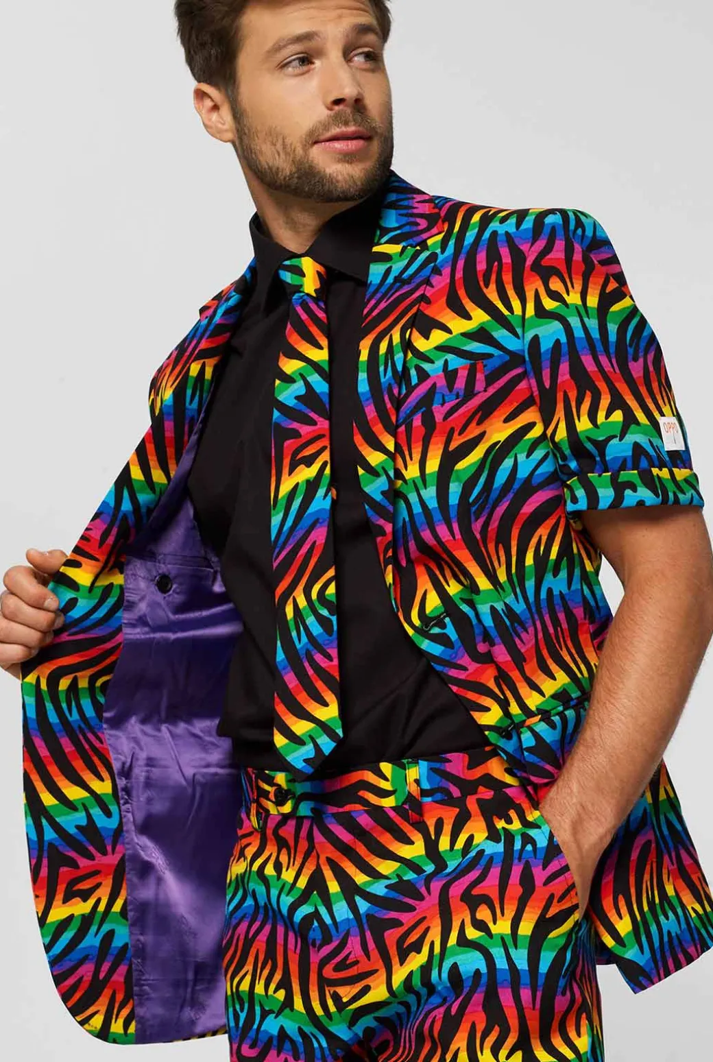 Laat je persoonlijkheid zien met deze kleurrijke, luchtige outfit. Het opvallende zebra-regenboogpak wordt geleverd met een short, een jasje met korte mouwen en een stropdas zodat jij er cool uit ziet en er comfortabel bij loopt op elke zonnige gelegenheid deze zomer. Of het nu een Prive evenement, een festival of een pool party is.